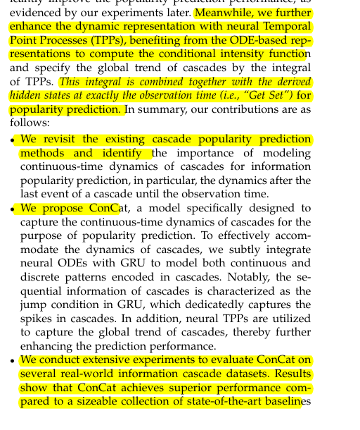 • Employs neural TPPs to capture global cascade trends