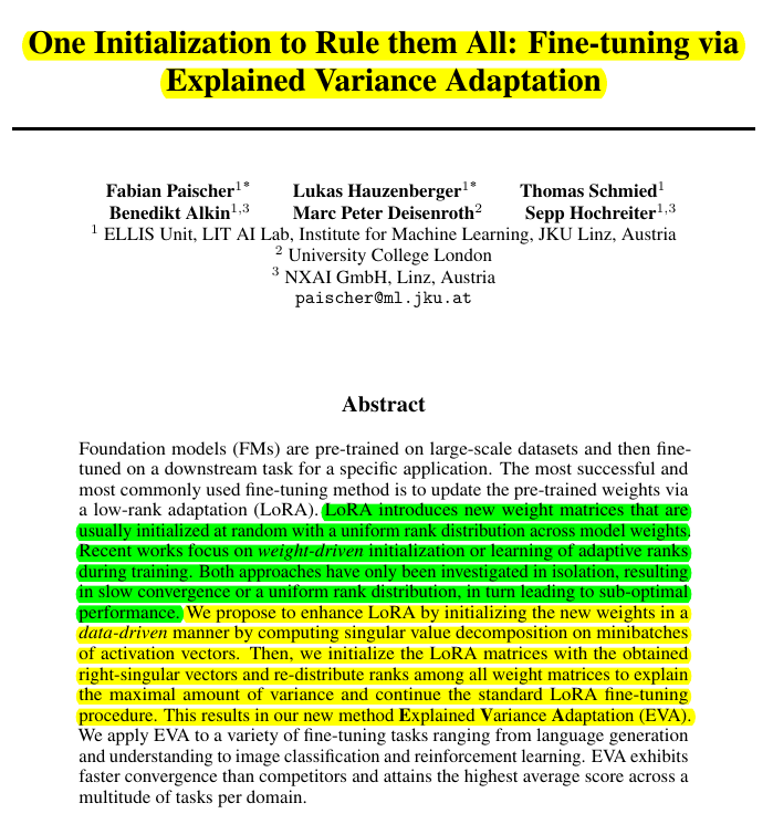 Explained Variance Adaptation (EVA) improves LoRA by letting data guide weight initialization and rank distribution across layers.