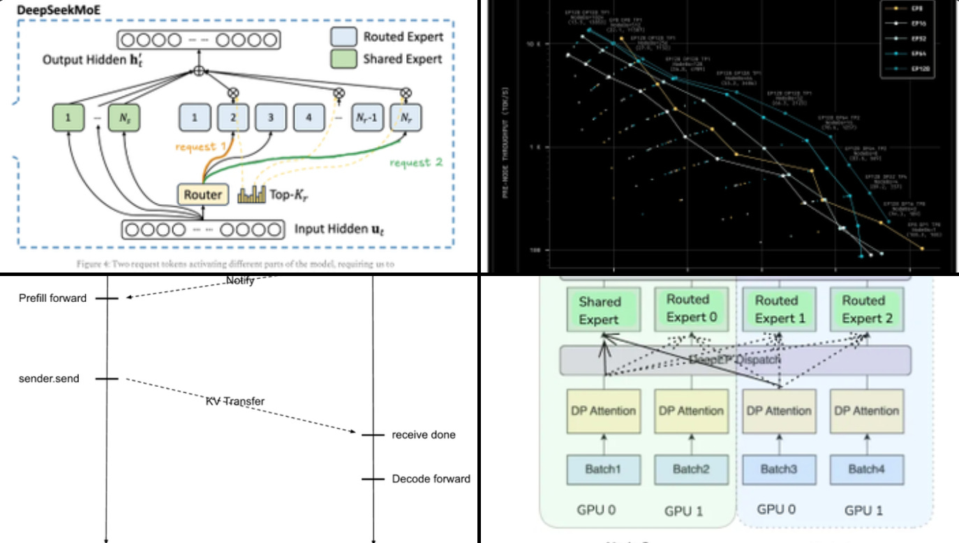 DeepSeek routing usually picks 8 experts from 256 per layer across 58 layers, which is why communication becomes the main cost. To control this, attention stays data parallel so the cache sits on one GPU, and only small activation vectors get moved across devices.