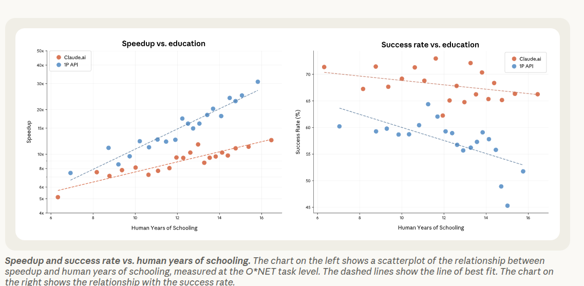 For API use, where Claude is called by software inside apps, the estimated success rate is lower at 49%. So chat use looks faster and more often ends in a “worked” outcome than automated API workflows, in their measurement.