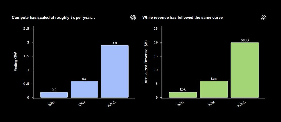 Compute rose from 0.2GW in 2023 to 0.6GW in 2024 to ~1.9GW in 2025, about 3x each year.