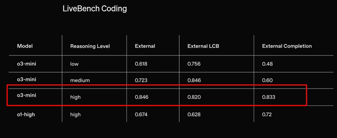 Special note on o3-mini’s superior performance on LiveCodeBench
