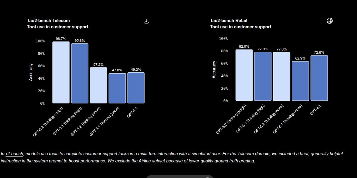 GPT-5.2 Thinking is much more reliable than earlier models at using external tools across long, multi-step customer support scenarios.