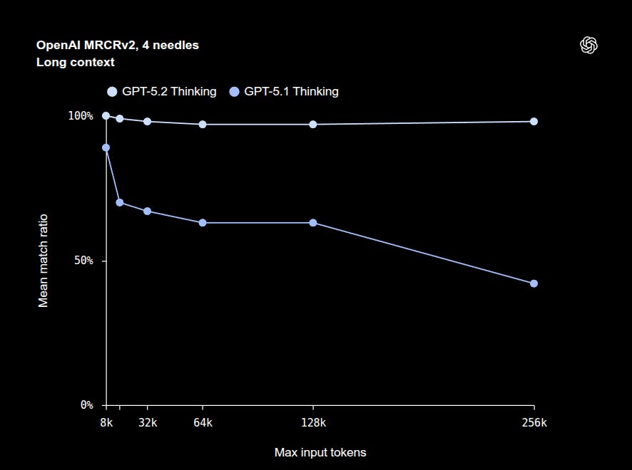 GPTā5.2 Thinking sets a new state of the art in long-context reasoning, achieving leading performance on OpenAI MRCRv2. GPT-5.2 Thinking keeps almost perfect recall of relevant information across very long inputs, while GPT-5.1 Thinking loses accuracy as the context gets bigger.