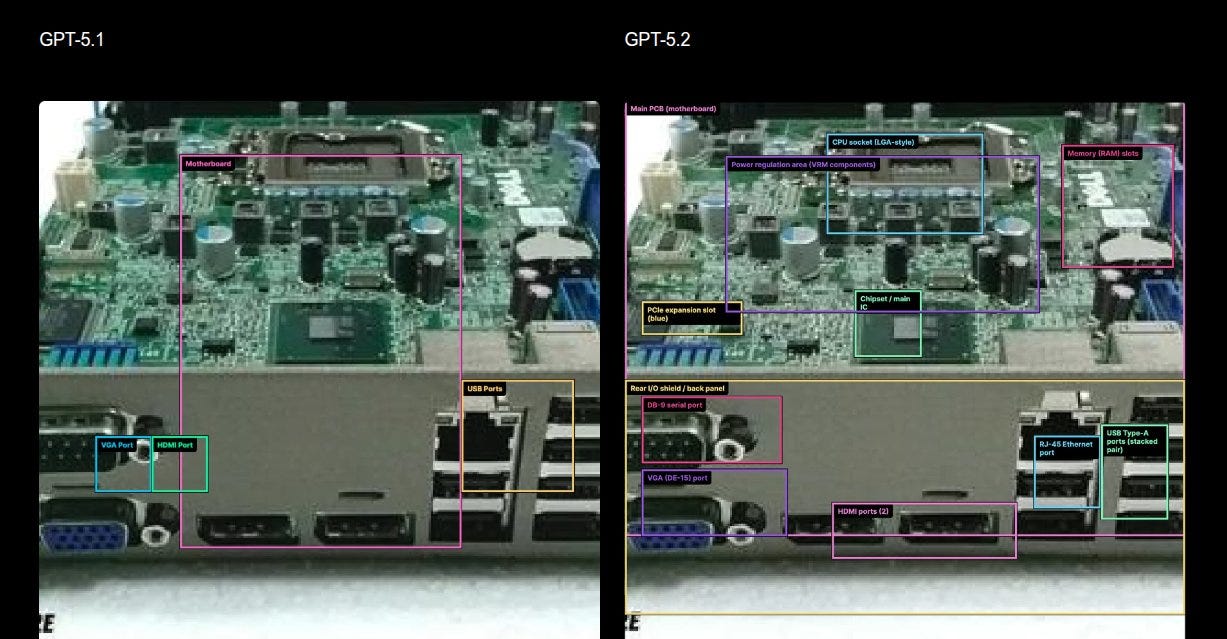 GPT-5.2 Thinking is better at understanding where things sit relative to each other inside an image, so it can label many more motherboard components with boxes that actually match their real positions.