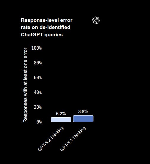 Response errors on de identified ChatGPT queries drop from 8.8% to 6.2%, so everyday research and writing should contain fewer wrong claims.