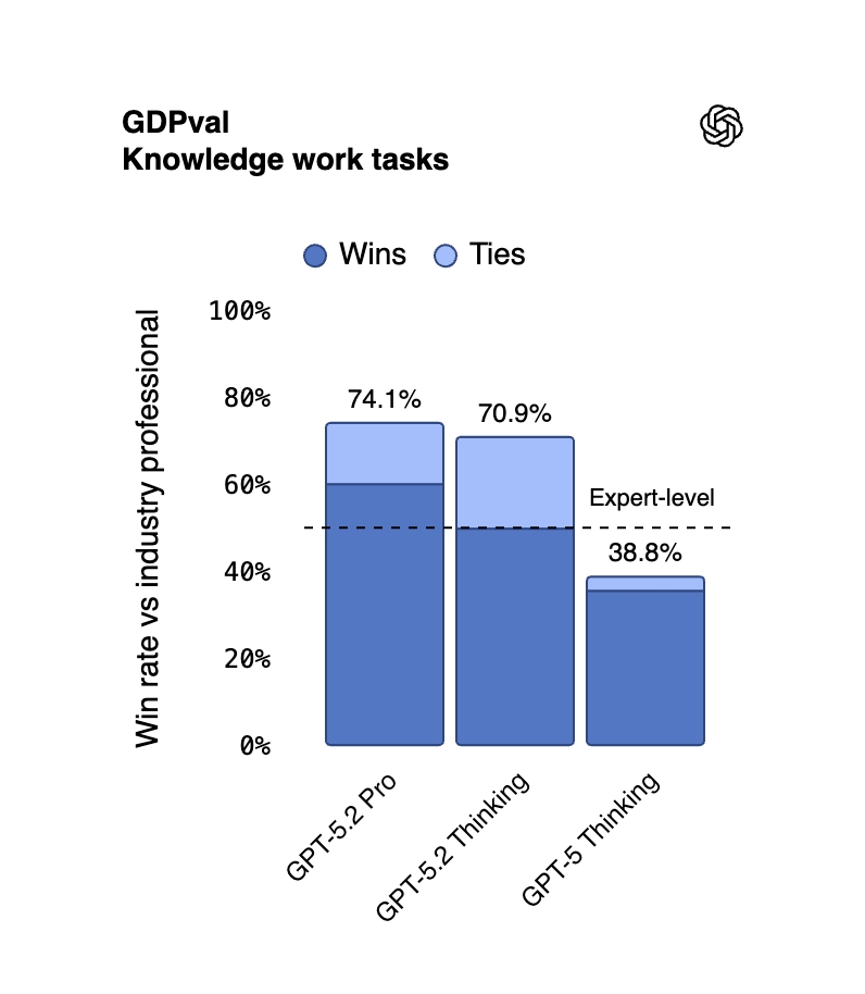 GPT-5.2 Thinking is their first model that performs at a human expert level on GDPval.