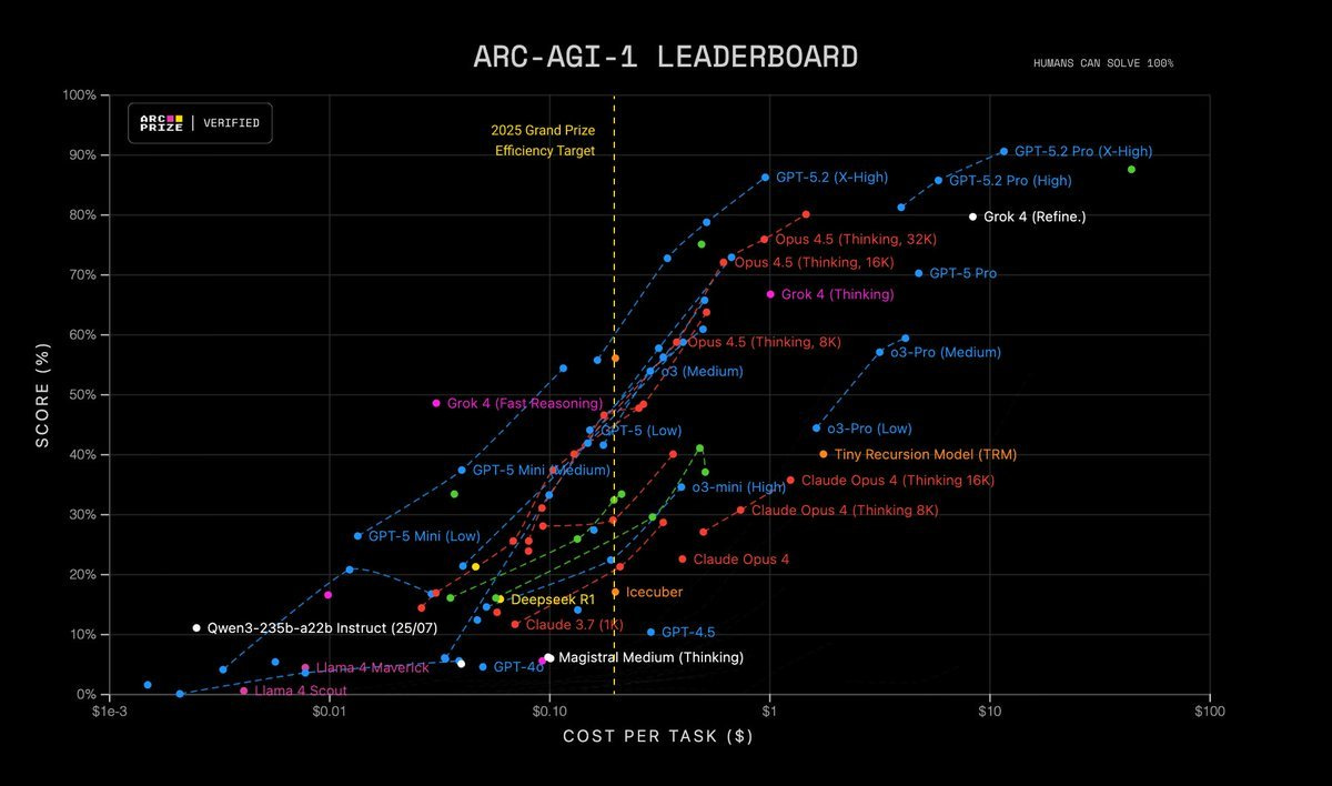 ARC Prize just verified GPT-5.2 Pro (X-High) at 90.5% on ARC-AGI-1 for $11.64 per task. Which beats prior records and shows a ~390X efficiency jump in just a year.