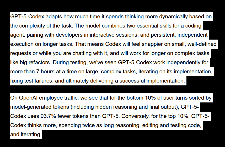 The coolest part of OpenAI's GPT-5-Codex release blog is the part about how the model adjusts reasoning dynamically to save tokens while still managing complex problems.