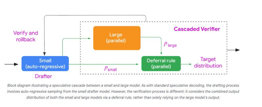 This will let small models and large models run together with a flexible token-by-token rule, giving faster speed and lower cost without losing quality. It combines the strengths of cascades and speculative decoding without inheriting their worst trade offs. So in this case, a small model drafts, a large model checks, and a deferral rule decides what to keep.