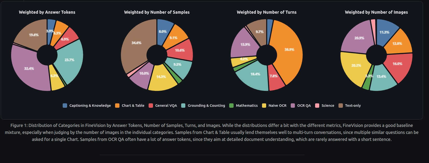 Distribution of Categories in FineVision by Answer Tokens, Number of Samples, Turns, and Images.