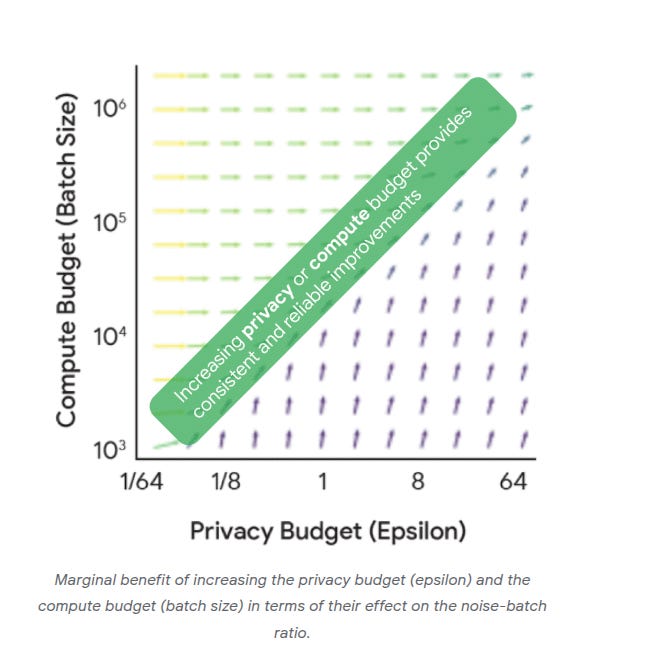The diagonal green stripe is saying that when you increase either the privacy budget or the compute budget, you get steady and reliable improvements in the noise-batch ratio. That ratio is the key measure of how much the added privacy noise drowns out the real learning signal.