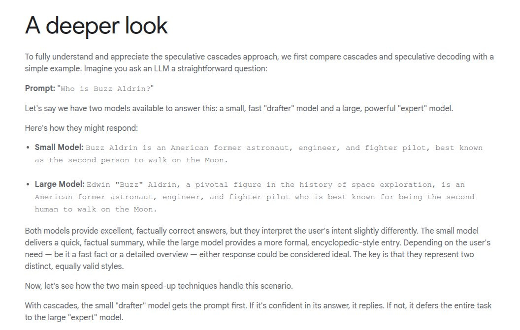 🧪 A simple example makes the failure mode of strict matching clear, the small model begins with “Buzz Aldrin” while the large model prefers starting with “Edwin”, strict speculative decoding rejects immediately even though both lead to correct answers. With speculative cascades, the deferral rule can accept the small model’s start because it is valid and confident, so the system keeps the speedup rather than throwing it away for style. This is the core benefit, the system gets correctness from the large model when it matters and keeps harmless differences from the small model when it does not.