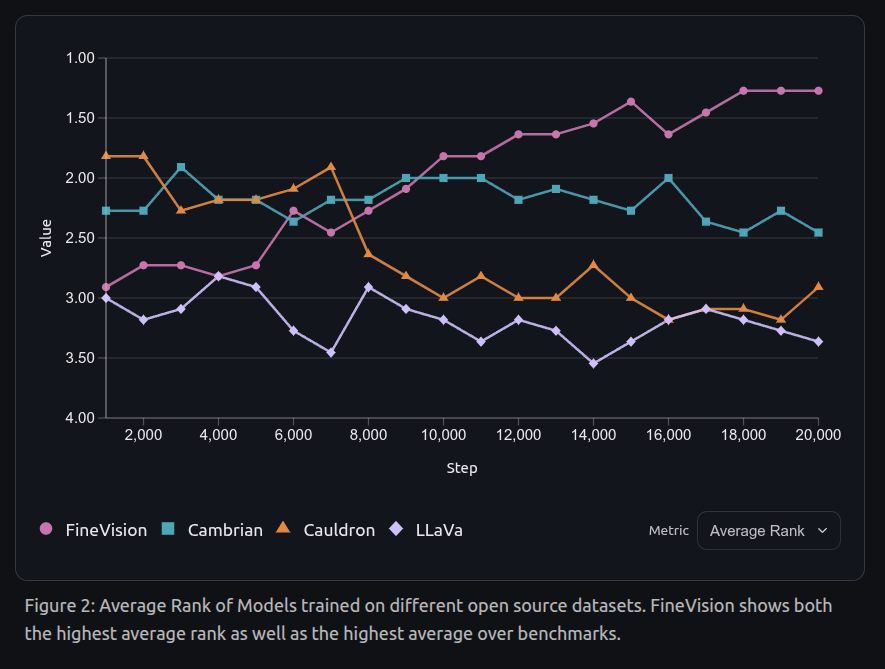 Average Rank of Models trained on different open source datasets. FineVision shows both the highest average rank as well as the highest average over benchmarks.