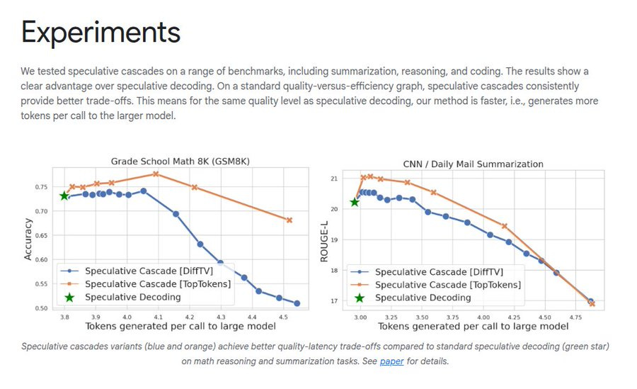 📈 Across summarization, translation, reasoning, coding, and question answering, variants of speculative cascades deliver better cost quality trade offs than plain cascades or plain speculative decoding, often with higher speedups at the same quality. The team reports the method as producing more tokens per large model call for the same quality curve and shifting the quality latency frontier in math reasoning and summarization. The experiments span both Gemma and T5 families, indicating the idea is model agnostic and acts at the inference policy layer rather than the architecture layer.