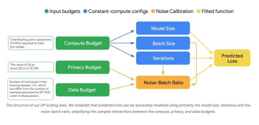 So the whole picture says: if you know your compute, privacy, and data budgets, then you can plan your training configuration, calibrate the noise, and use the scaling law to estimate model quality before even running the training.