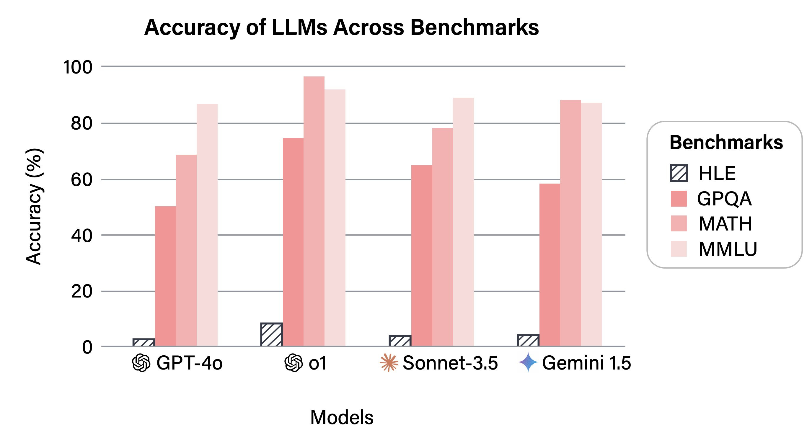 → Frontier LLMs, including Google's Gemini 1.5 Pro, Anthropic's Claude 3.5 Sonnet, and OpenAI's o1, scored below 10% accuracy on HLE, demonstrating low accuracy and high overconfidence.