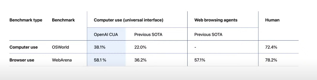 As you can see from the above image, in "Computer use" (OSWorld benchmark), OpenAI CUA scores 38.1%, outperforming the previous SOTA at 22.0%, but still lags behind human performance at 72.4%. For "Browser use" (WebArena), CUA achieves 58.1%, again surpassing the previous SOTA of 36.2% and slightly edging out "Web browsing agents" SOTA at 57.1%, yet remains below human performance at 78.2%. These figures highlight CUA's advancement in computer and browser interaction, while indicating ongoing areas for improvement to reach human-level proficiency.
