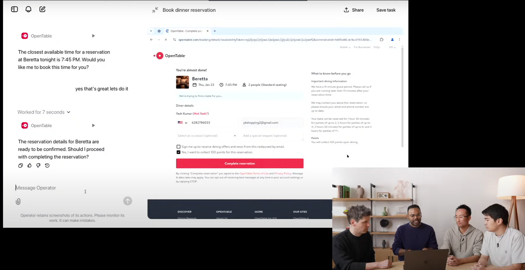 → In the OpenAI Operator demo, witness the Operator AI agency in action as it autonomously books a restaurant and shops for groceries online. Operator instantiates a remote browser. The agent clicks around and interacts with the webpage to complete the task. Observe how Operator, powered by CUA, navigates websites, interacts with UI elements, and even self-corrects when faced with location mismatches. For critical actions, Operator asks the user for confirmation.
