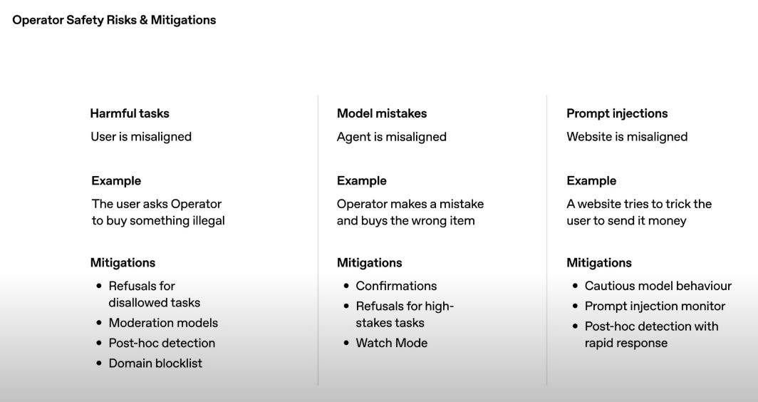 → The Operrator will refuse harmful tasks, avoid blocked websites, and prevent spam. Confirmation is a key mitigation strategy built into Operator. There is also a prompt injection monitor as an extra layer of security.