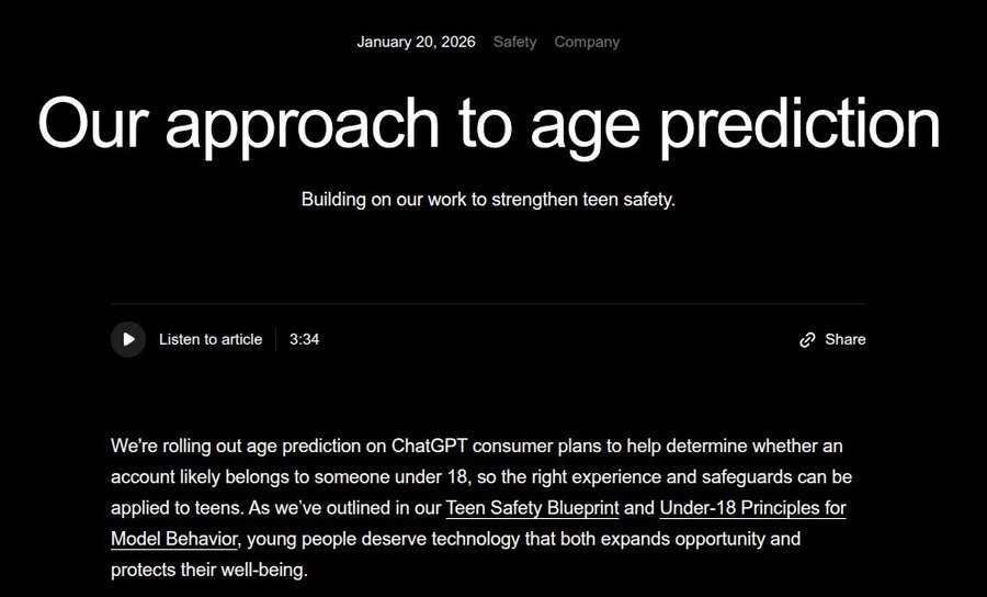 š OpenAI is moving from ātell us your age onceā to continuous, probability-based age gating.