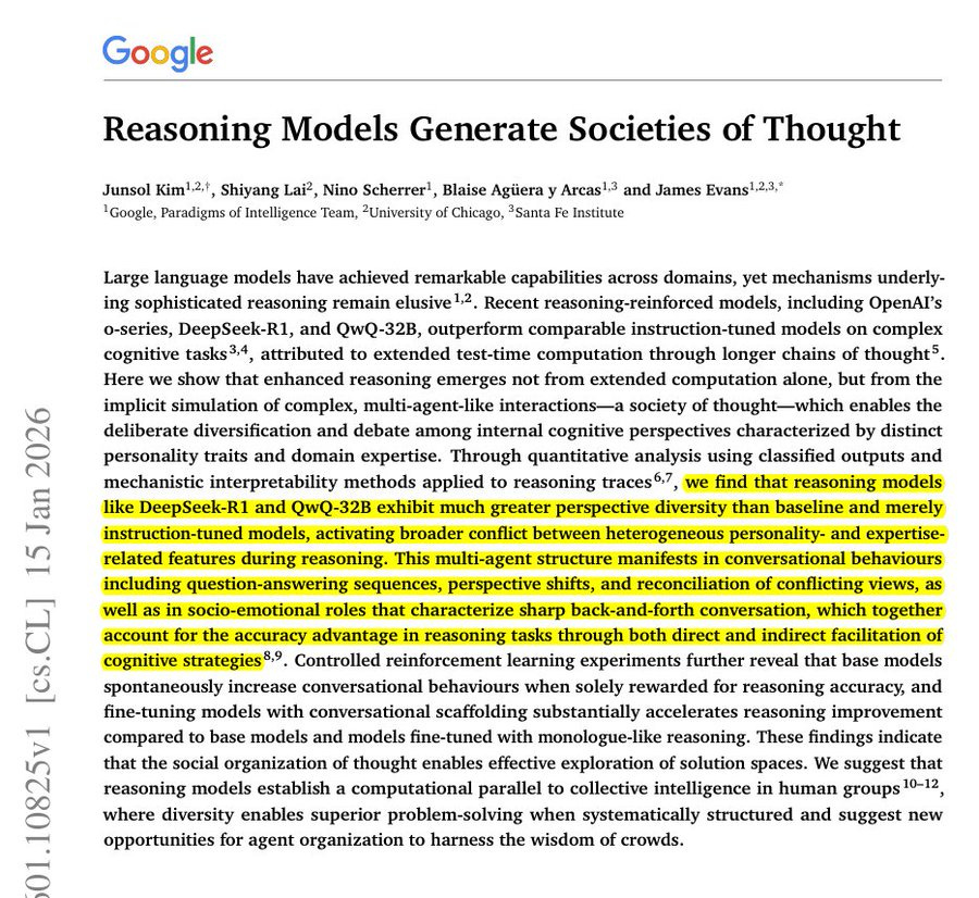 They claim āthink longerā is not the whole story. Rather thinking models build internal debates among multiple agentsāwhat the researchers call āsocieties of thought.ā Through interpretability and large-scale experiments, the paper finds that these systems develop human-like discussion habits: questioning their own steps, exploring alternatives, facing internal disagreement, and then reaching common ground.