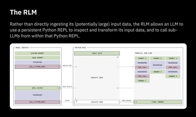 So if the model wants to deal with a massive PDF, dataset, or long transcript, it has to use Python to slice and filter, and it often has to ask sub-LLMs to scan chunks and return short answers.