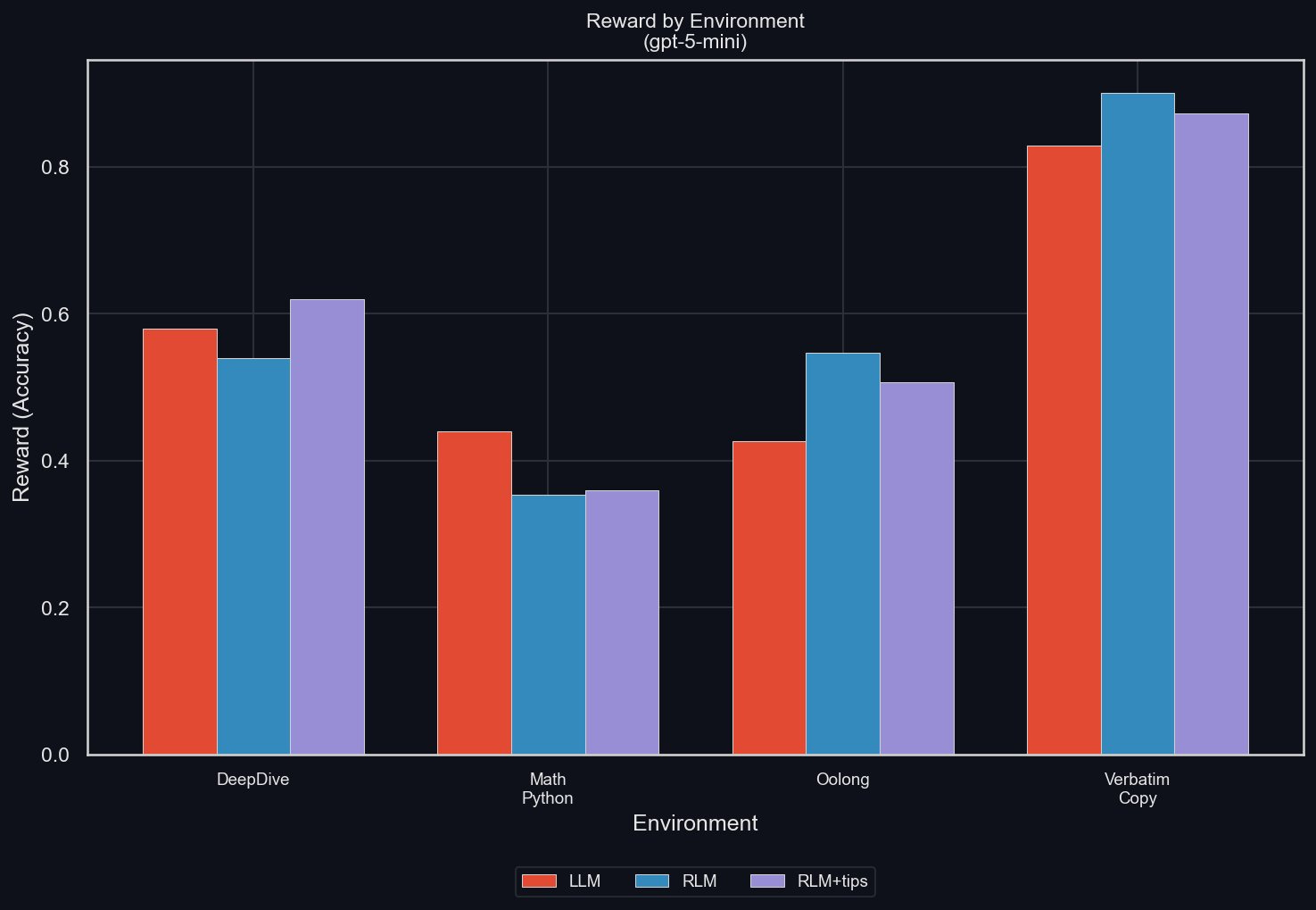 Extreme Efficiency: Benchmarks show that a wrapped GPT-5-mini using RLM outperforms a standard GPT-5 on long-context tasks while using less than 1/5th of the main context tokens.