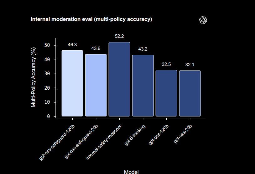 On internal multi-policy accuracy, where a single input must be correct under several policies at once, gpt-oss-safeguard-120b scored 46.3% and gpt-oss-safeguard-20b scored 43.6%, while the internal Safety Reasoner reached 52.2%, and gpt-5-thinking reached 43.2%.
