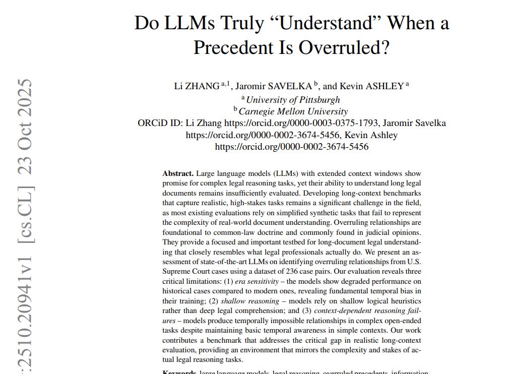 Says strong LLMs still fail at a basic legal task across long documents. The paper builds a realistic test using full opinions and asks models to find explicit overruling.