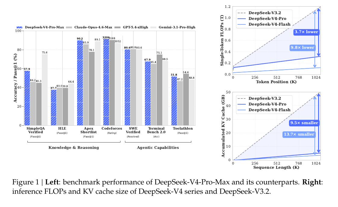 The big result is that at a 1M-token context, DeepSeek-V4-Pro uses about 27% of the single-token compute and 10% of the KV cache of DeepSeek-V3.2, while still staying competitive on many major benchmarks.
