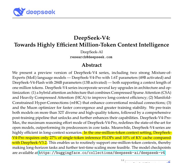 So the big deal is that the paper is proposing a new efficiency recipe for LLMs, where better memory handling changes the cost curve itself, which is why DeepSeek-V4 can reach 1M tokens while using far less compute and cache than DeepSeek-V3.2.