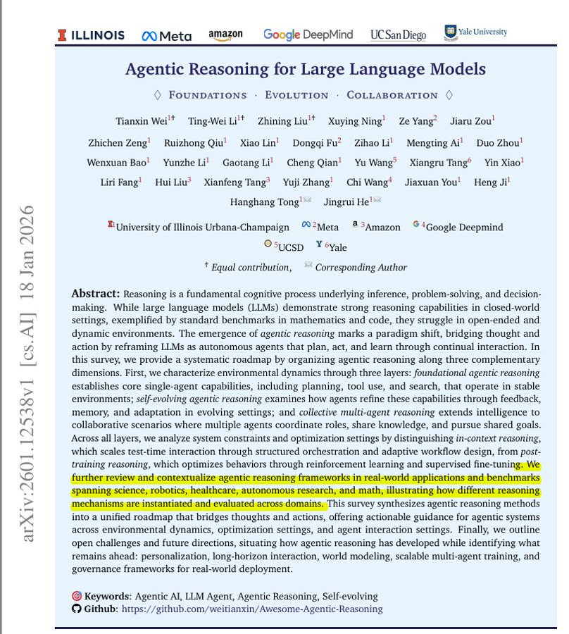 They also separate changes done at run time, like step by step prompting and choosing which tool to call, from post training changes, where the model is trained again using examples or rewards. Instead of new experiments, the paper maps existing agent systems, applications, and benchmarks onto this roadmap, making it easier to design agents for web research, coding, science, robotics, or healthcare. The main takeaway is that better real world reasoning comes from a repeatable plan, act, check loop plus memory and feedback, not only bigger models.