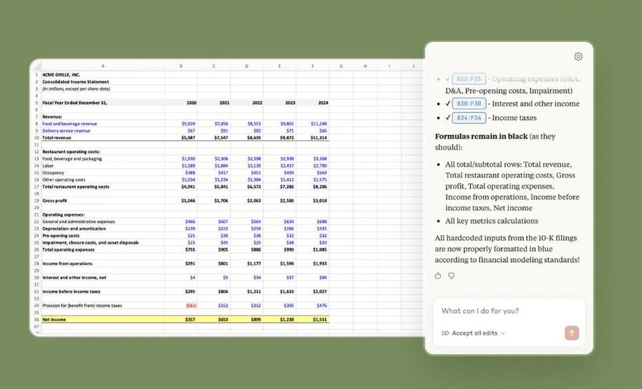 Claude sits in your spreadsheet sidebar, scans your entire workbook—formulas, sheets, links—and lets you actually chat with it.