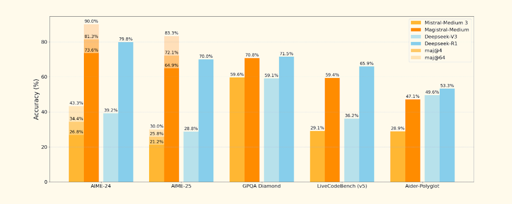 → On benchmarks, Magistral Medium scores 73.6% on AIME-24, rising to 90% with majority voting. Magistral Small scores 70.7% and 83.3% respectively. It performs competitively but doesn’t top the charts on all tasks — Gemini and Claude still lead in some benchmarks like GPQA and LiveCodeBench.