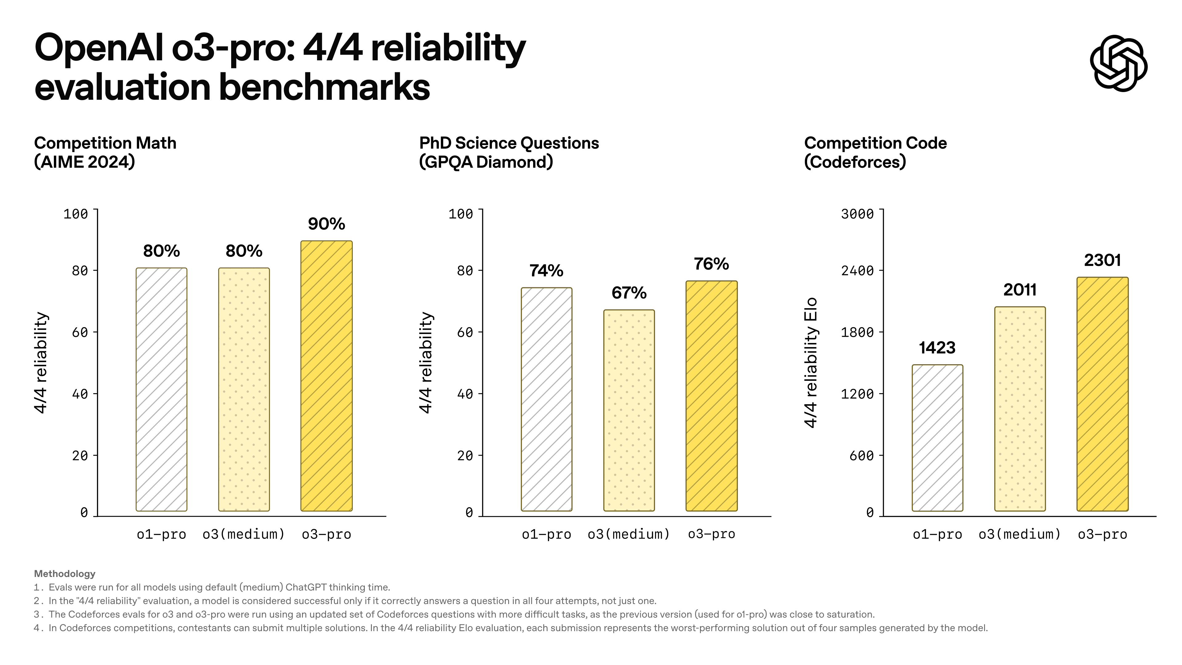 → o3-pro excels in "4/4 reliability" benchmarks: 90% in AIME (math), 76% in GPQA Diamond (PhD-level science), and a 2301 Elo score in Codeforces (coding). This means it gets all four tries correct, not just one.