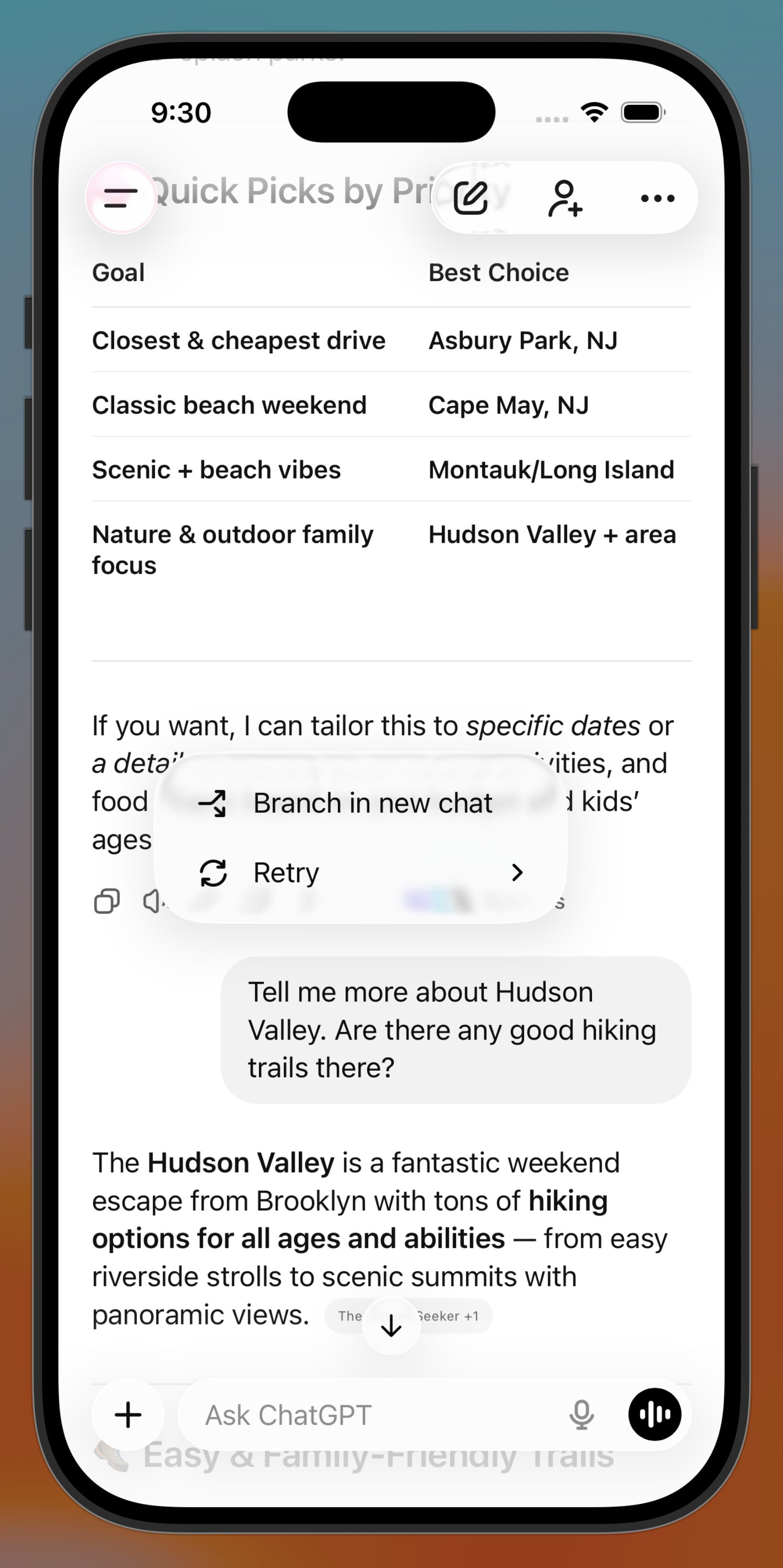 For example, if you are discussing weekend getaway options near Brooklyn, ChatGPT might suggest places like Asbury Park for beach vibes, Cape May for relaxation, Montauk for scenery, or the Hudson Valley for hikes. You can pick one, say Hudson Valley, and start asking more detailed questions. Branching lets you do that in a new path while keeping your initial chat intact.