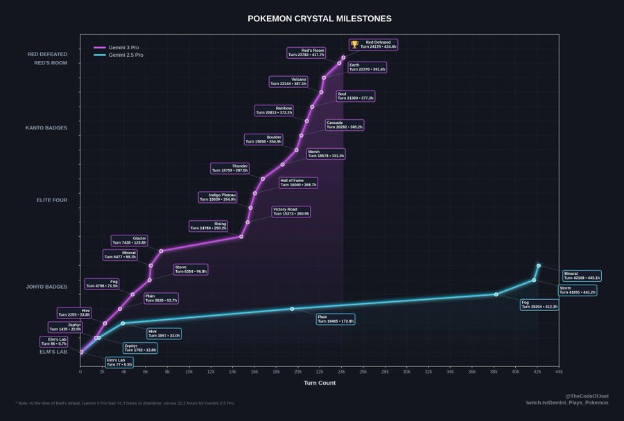 They benchmarked Gemini 3 Pro against Gemini 2.5 Pro on a full run of Pokémon Crystal (which is significantly longer/harder than the standard Pokemon Red benchmark).