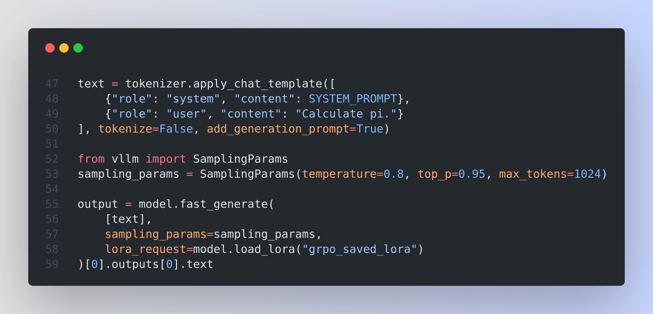 Model Initialization and LoRA Integration Next, the notebook loads a base model and applies LoRA adapters so that GRPO training can be performed efficiently. The model is loaded in a memory-efficient 4-bit mode and with fast inference enabled. For example: