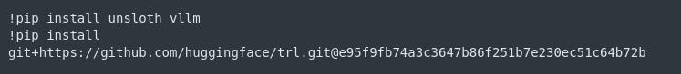 Setup and Dependencies Unsloth requires its own library along with fast inference support from vLLM. In addition, a patched version of the TRL library is used so that GRPO works seamlessly with LoRA and QLoRA fine-tuning. For example, the installation commands are as simple as: