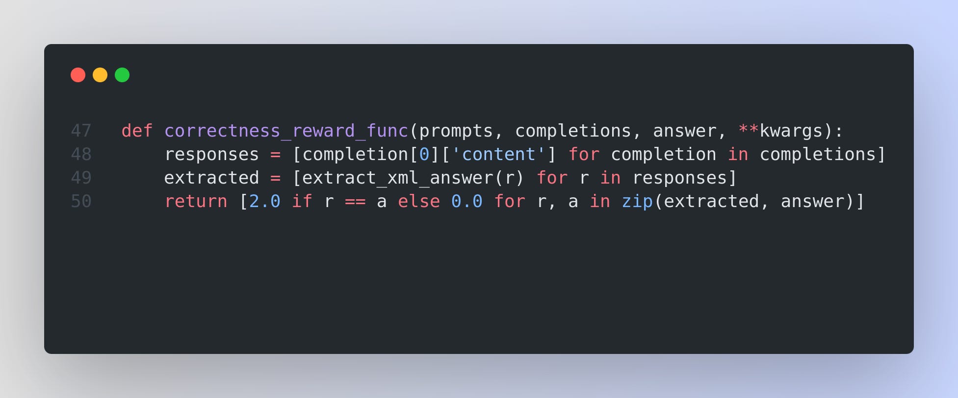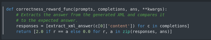 Several reward functions are defined to guide the reinforcement learning process. These functions assess the generated outputs based on criteria like correct arithmetic answers, adherence to a specific XML-like format, or even a simple count of expected tokens. One minimal example is: