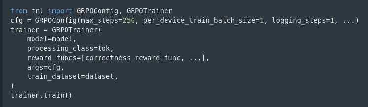 This function (along with others such as soft/strict format check and integer reward functions) is passed into the trainer to drive the model’s “aha moment” behavior. training the Model with GRPO Training is managed by the GRPOTrainer class from TRL.