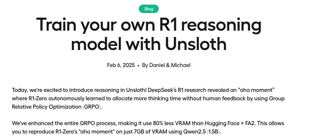 Their new GRPO uses 80% less VRAM than Hugging Face + FA2, allowing you to reproduce R1-Zero's "aha moment" on just 7GB of VRAM using Qwen2.5 (1.5B).
