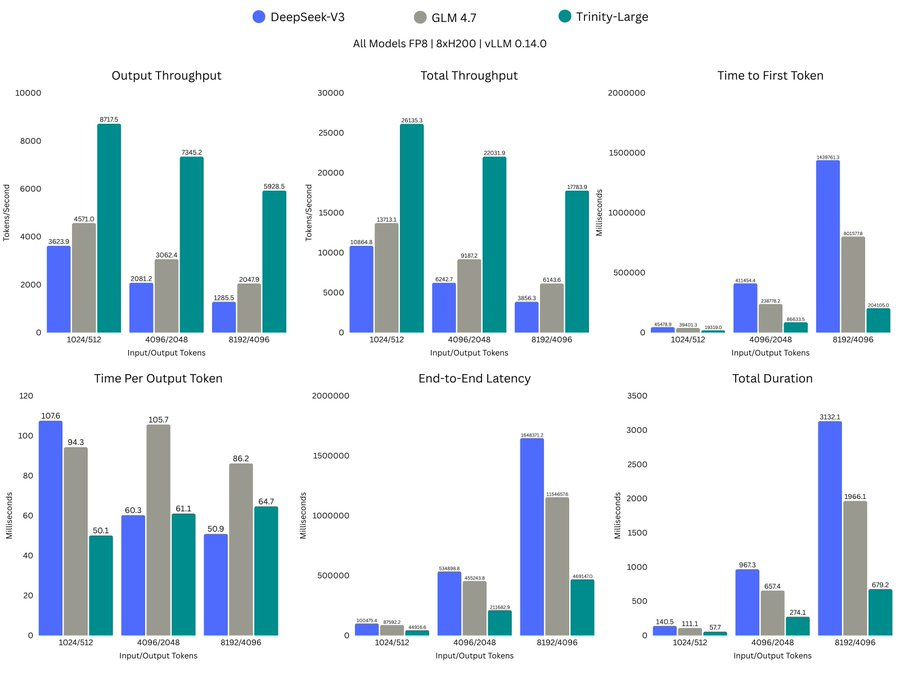 On 8xH200 with FP8 in vLLM0.14.0, Trinity shows 8,717tok/s output throughput vs 3,624 for DeepSeek-V3 at 1,024/512, and 469,147ms end-to-end latency vs 1,648,371ms at 8,192/4,096.