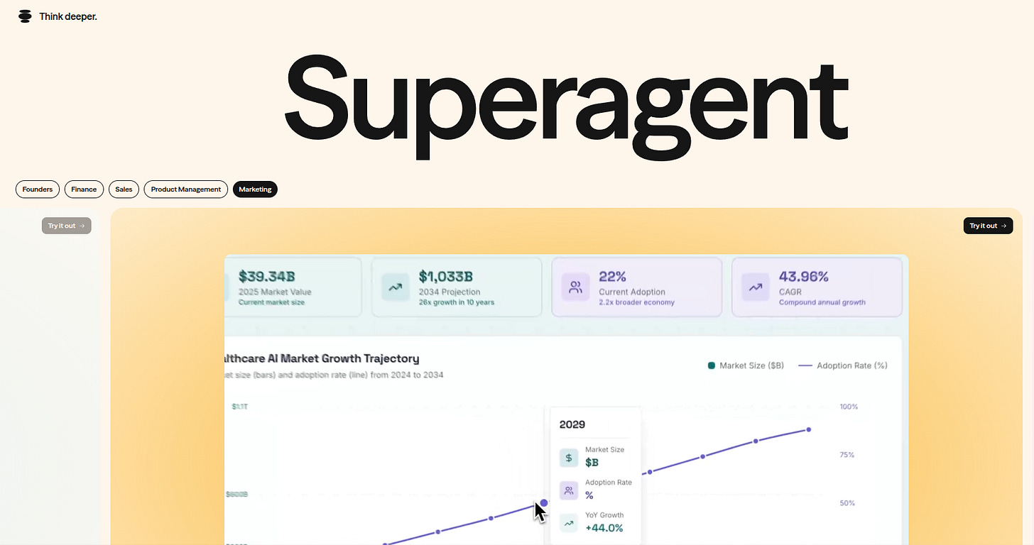 📊 The SuperReport: The primary output of Superagent is not a text summary, but what they call a SuperReport. This is a rich, fully interactive, aesthetically designed website generated on the fly.