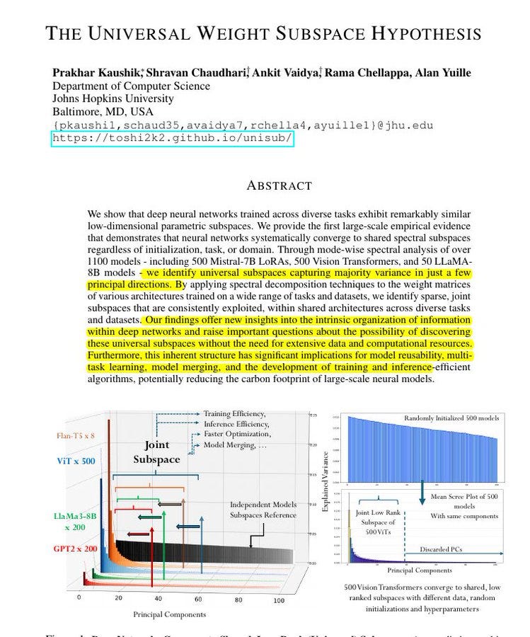 Says that many separately trained neural networks end up using the same small set of weight directions. Across about 1100 models, they find about 16 directions per layer that capture most weight variation.
