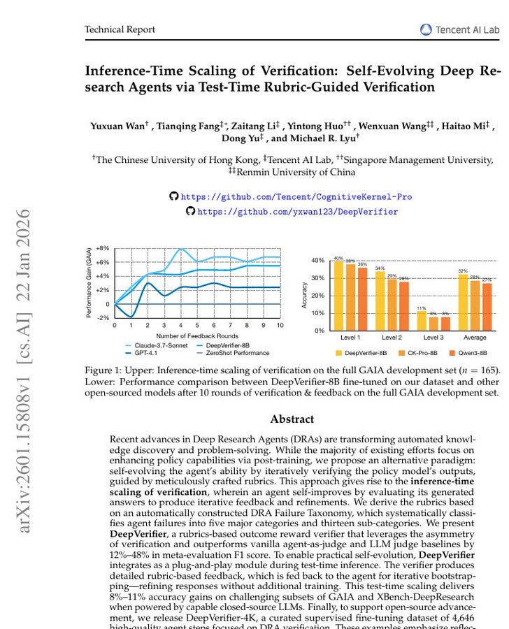 Deep research agents, meaning LLMs that browse and use tools, often fail because 1 early mistake can snowball across many steps. The authors use 1 idea: checking an answer is often easier than producing it, so the agent should spend extra effort verifying.