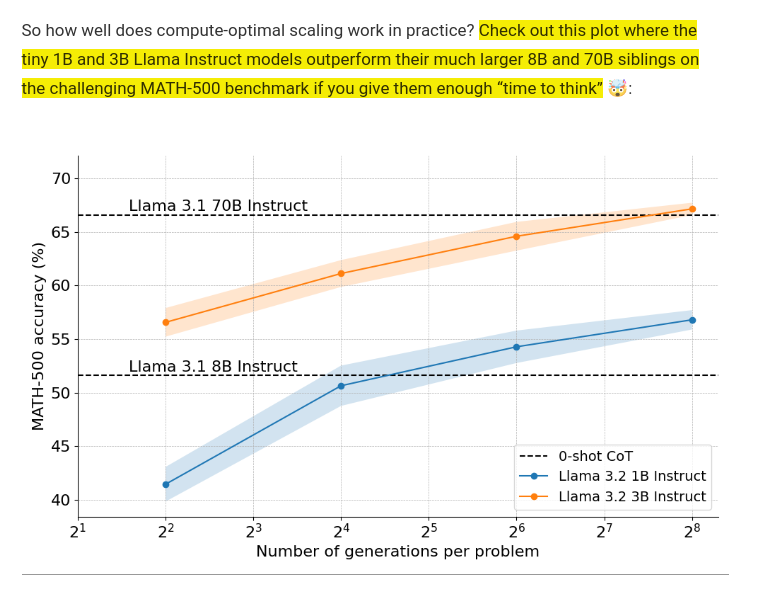Smaller models (1B, 3B) achieve performance of much larger models (8B and 70B) through increased sampling iterations. When given more generations per problem (x-axis: 2^1 to 2^8), these compact models leverage multiple solution attempts to surpass larger models' single-shot capabilities, demonstrating efficiency over raw parameter count.
