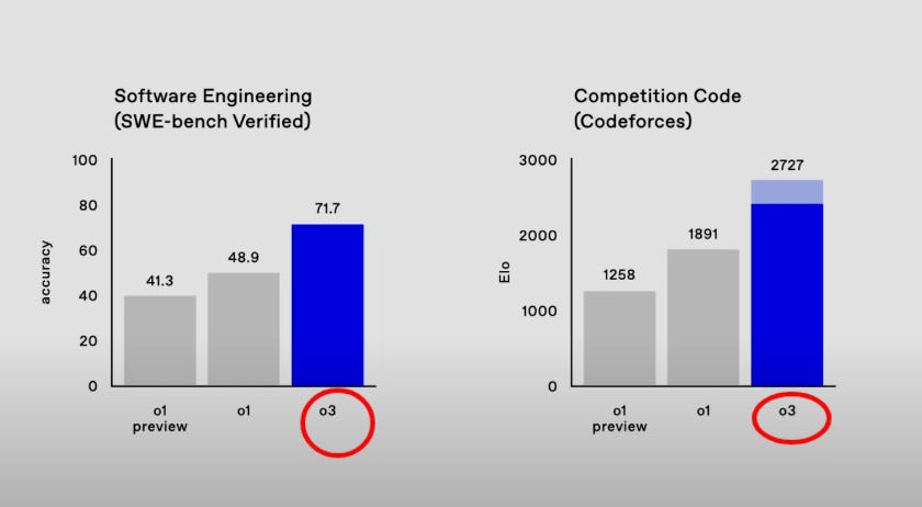 → 03 demonstrates exceptional technical capabilities: 71.7% accuracy on real-world software tasks on SWE-bench (20% better than 01), 2727 Elo rating in competitive coding, and 96.7% accuracy on math olympiad problems. On GPQA Diamond PhD-level science questions, it scores 87.7% (10% above 01).