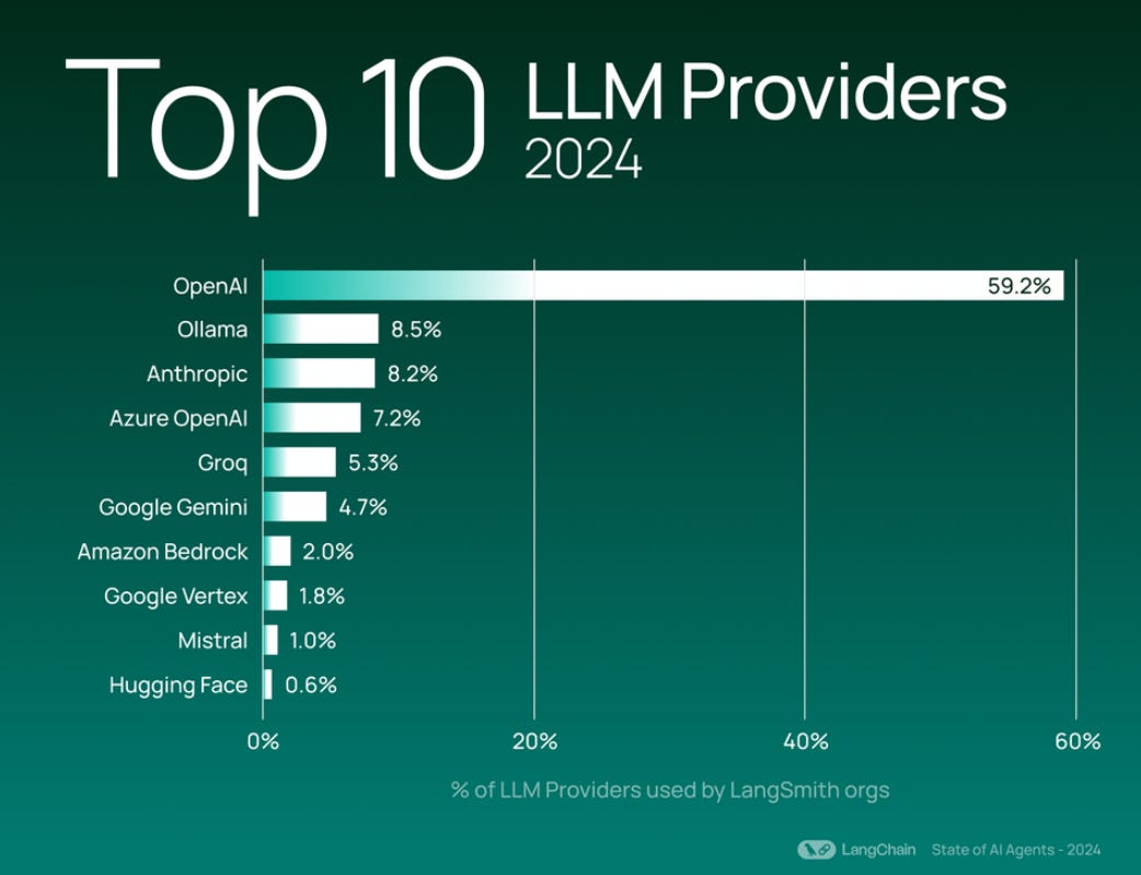 → The LLM provider landscape shows OpenAI's dominance at 59.2% usage, Interestingly, Ollama and Groq (which both allow users to run open source models, with the former focusing on local execution and the latter on cloud deployment) have accelerated in momentum this year, breaking into the top 5. Open-source providers collectively represent 20% of top LLM usage, demonstrating growing interest in flexible deployment options.
